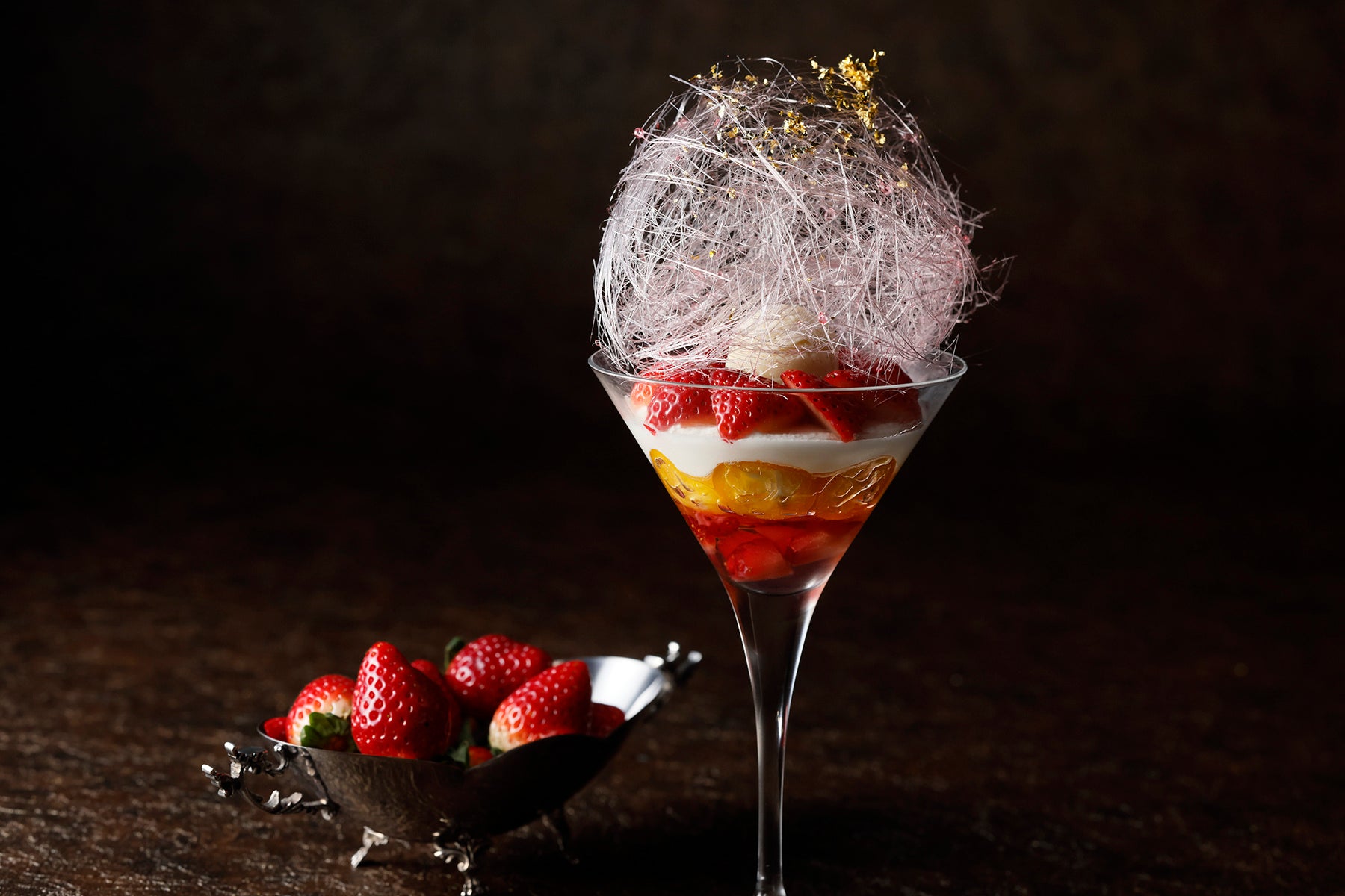 1・2月に登場する『大人のいちごパフェ』は、いちご本来の香りと瑞々しさを閉じ込めたジュレをベースに、フレッシュないちご、優雅な白ワイン風味の金柑のコンポートを重ねた、冬ならではの華やかな一品です。中央にはバニラアイス、仕上げには繊細にきらめく飴細工と金箔を纏わせました。主役であるいちごの可憐さが際立つ、冬にふさわしい上質なパフェです。