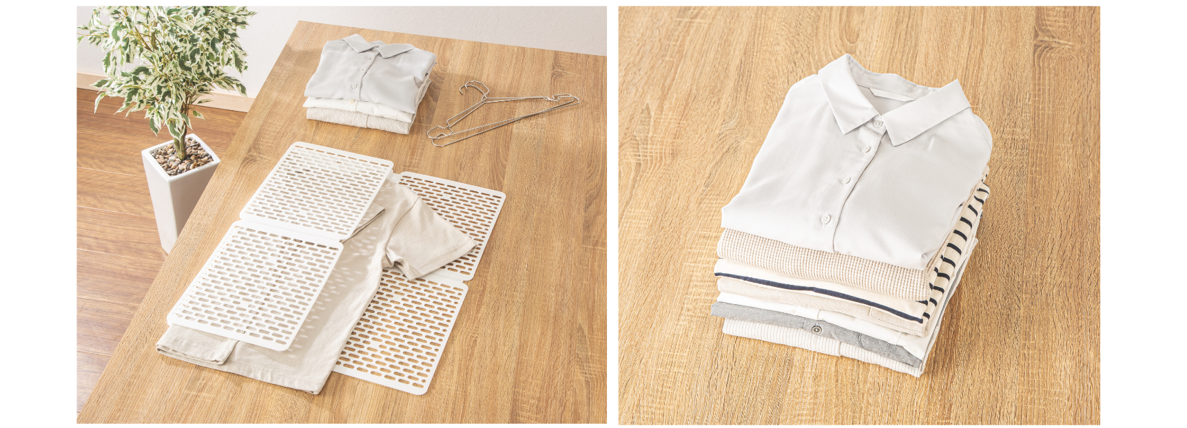今回新発売する「衣類折りたたみボード」は、『家事をもっと手軽に、家族みんなで』をコンセプトに開発しました。3ステップのシンプルな操作で衣類をきれいに折りたたむことができ、仕上がりが美しくそろいます。たたんだ衣類はサイズが均一になるため、引き出しや収納ボックスに無駄なく収まり、収納効率が向上します。