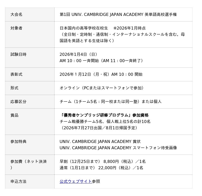 UNIVERSITY CAMBRIDGE JAPAN CONSULTING SUPERVISOR Co. Ltd.(代表:尾尻佳津典)は集中出版株式会社と共催し、「UNIV. CAMBRIDGE JAPAN ACADEMY」の教育事業の一環として、2026年1月4日(日)に全国の高校生を対象にオンライン形式で「第1回 UNIV. CAMBRIDGE JAPAN ACADEMY 英単語高校選手権」を開催いたします。