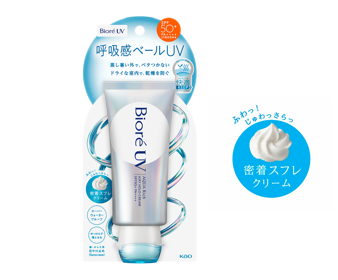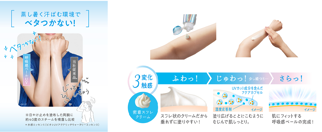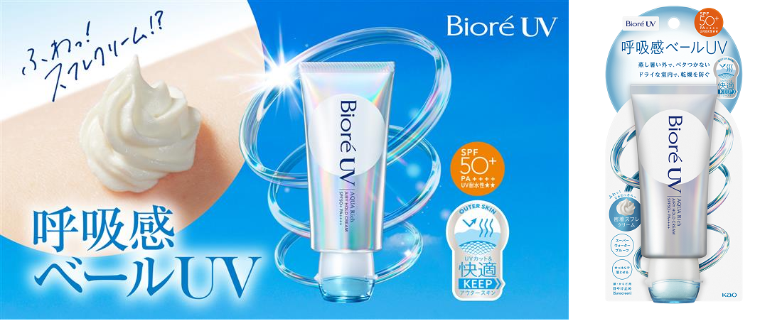 紫外線量・気温・湿度など地球全体の気候が変化している今、生活者は紫外線とともに室内外の温度・湿度変化にさらされています。そこで花王は、肌表面の湿度環境に着目した日やけ止め『ビオレUV アクアリッチ エアリーホールドクリーム』(通称:呼吸感ベールUV)を、日本・タイ・台湾・香港の一部ドラッグストアにて2025年3月に先行販売しました(参考リリース:花王 | 『ビオレUV アクアリッチ エアリーホールドクリーム』限定発売)。本商品は、UVカット&快適KEEPアウタースキンを採用。高い紫外線防御効果に加えて、湿度に応じて膜の厚みが変化し肌表面を快適にし続けます。蒸し暑い外でベタつかず、ドライな室内で乾燥を防ぐ日やけ止めの新価値提案により、当初販売計画の1.5倍の売れ行きを達成*3。使用したお客さまの89%が使用感のよさからまた使いたいと回答*4し、高い支持をいただきました。「出したときは“ふわっ”、塗り広げるときは“じゅわっ”と肌になじんでいく密着スフレクリームで、思わずたっぷりと肌に塗りたくなる」「蒸し暑い場所でも、エアコンが効いた部屋でも、肌のベタつきを感じず快適に過ごせた」など、新感触のテクスチャーと、つけた瞬間から日中まで続く快適な使い心地に好評の声があがっています*4。*3 日本・タイ・台湾・香港での実績