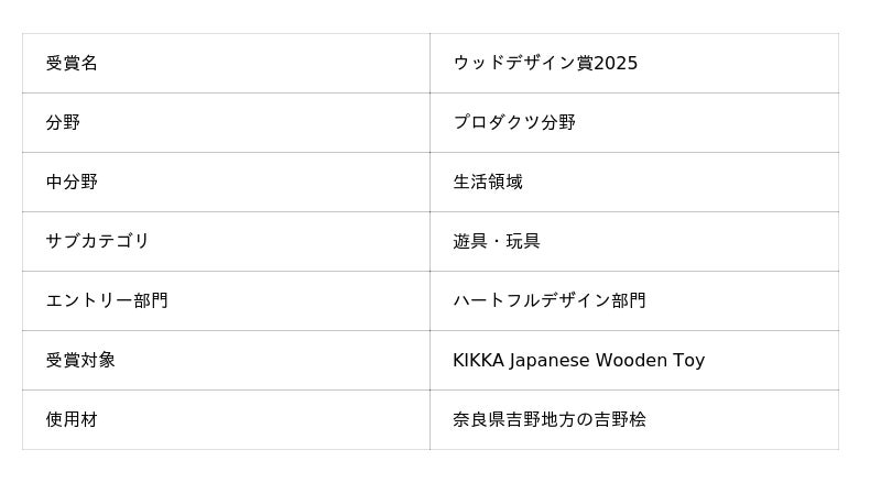 本受賞は、プロダクツ分野・生活領域・サブカテゴリ:遊具・玩具において、奈良県吉野地方の吉野桧(よしのひのき)を活用したプロダクトのぬくもりと、子どもたちや家族に寄り添う心あたたまるデザインが高く評価されたものです。