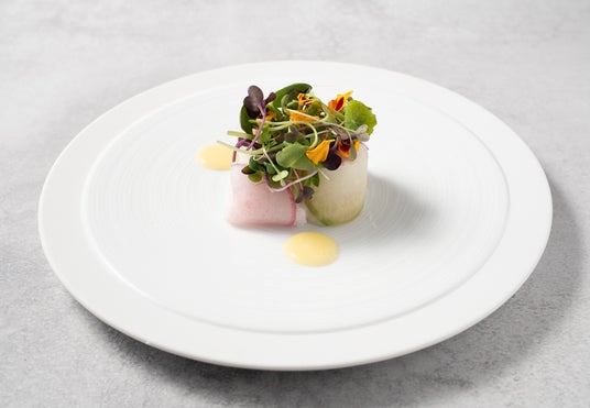見た目も美しい“おかゆ寿司”ディナー限定で登場する、おかゆ寿司。薄く切った大根で、その時期ならではの厳選した鮮魚とおかゆを包みました。ソースも季節の柑橘を使用し、一品で旬を様々な角度からお楽しみいただけます。とろけるおかゆと旬の魚のハーモニー、見た目にも美しい一品です。