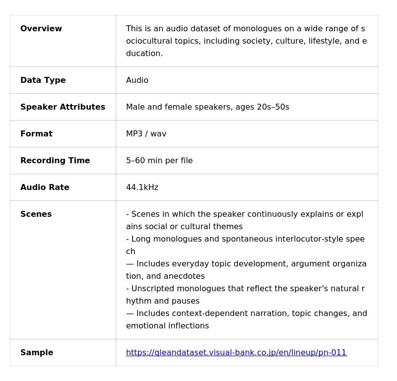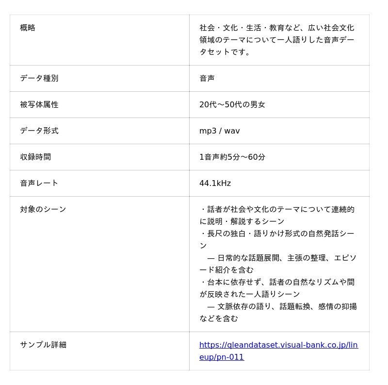 Visual Bank株式会社(東京都港区、代表取締役CEO 永井真之、以下「Visual Bank」)は、傘下の株式会社アマナイメージズを通じて展開するAI学習用データソリューション『Qlean Dataset(キュリンデータセット)』において、『日本語・1話者・社会/文化テーマトーク音声コーパスデータセット』の提供を開始しました。本データセットは、日常の出来事、家族や学校生活の思い出、価値観や気づきなど、身近なテーマについて話者が一人で語る音声を収録しており、音声認識(ASR)、自然言語処理(NLP)、生成AI基盤モデルなどの学習・評価に活用できます。