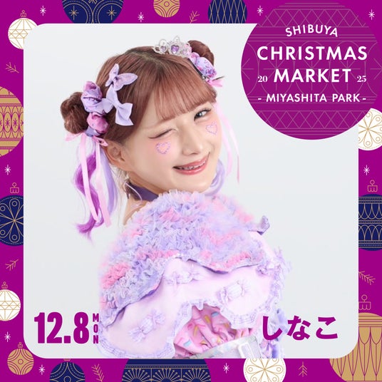 BE STAGE))にて初開催される「SHIBUYA CHRISTMAS MARKET 2025」。そのイルミネーション点灯式の第二弾が12/8(月)に開催され、大人気原宿系動画クリエイターのしなこがゲストとして登場した。