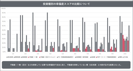 さらに投資している層の中でも、不動産(一棟・区分)などを保有している層では幸福度が7点台と高く、不動産を保有していない層(6点未満)との差が広がる結果となりました。