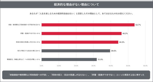 経済的自由が「ない」と回答した人に理由を複数回答で尋ねると、「老後資金や教育費など将来負担への不安」、「将来の収入・支出の見通しが立たない」、「貯蓄・投資が十分でない」といった項目が上位に挙がりました。
