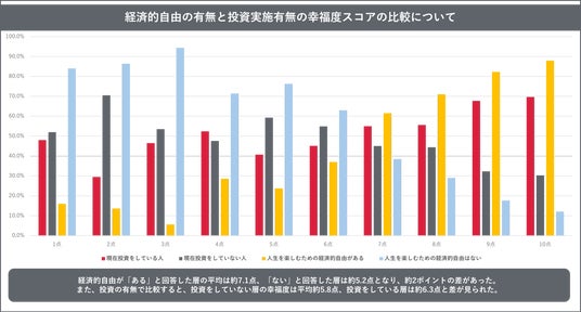 経済的自由が「ある」層の幸福度は「ない」層より約2ポイント高く、投資層の中でも不動産投資ありの層がなしの層より幸福度が高い。