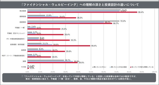 「ファイナンシャル・ウェルビーイング」を理解している投資層は、株・投信に加えて不動産、債券など複数資産を組み合わせる割合が高い。