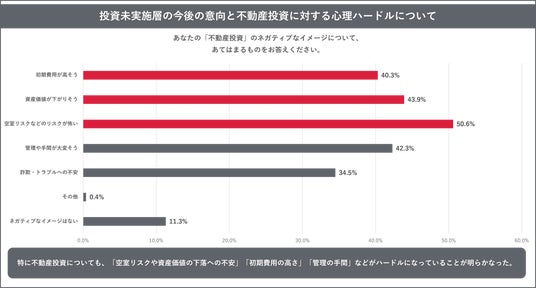 現在投資をしていない層に今後の意向を聞くと、約3人に1人が「近いうちに始めたい」「いずれ始めたい」と回答しました。一方で、「興味はあるが始める予定はない」「始めるつもりはない」と答えた人も合計で約2/3を占めており、「関心はあるが一歩踏み出せない」層が多いことが分かります。投資をしていない理由としては、「リスクが怖い」「知識や経験が足りない」「まとまった資金がない」といった項目が上位に挙がり、特に不動産投資についても、「空室リスクや資産価値の下落への不安」「初期費用の高さ」「管理の手間」などがハードルになっていることが明らかになりました。