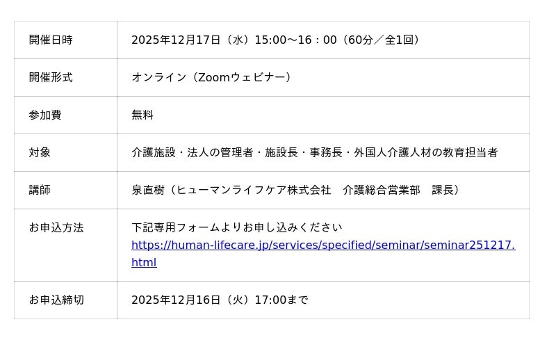 介護事業等を展開するヒューマンライフケア株式会社(本社:東京都新宿区、代表取締役:瀬戸口信也、以下「当社」)は、外国人介護人材に関する無料オンラインセミナー「「育成就労」と「パート合格」、国が舵を切った外国人の長期育成と介護施設経営の一手とは?」を、12月17日(水)に開催いたします。