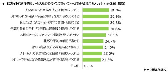 続いて、「メリットがある」と回答した389人を対象に、メリットだと思う項目を聞いたところ、「好みに合った商品やプランを提案してくれる」が31.3%と最も多く、次いで「見つけられない新しい商品や旅行先を知ることができる」が30.9%、「困ったときにAIチャットですぐに質問・相談できる」が30.8%となった。