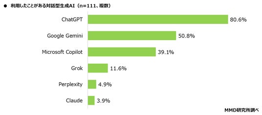 対話型生成AIを利用したことがある111人を対象に、利用したことがある対話型生成AIを聞いたところ(複数回答可)、「ChatGPT」が80.6%と最も多く、次いで「Google Gemini」が50.8%、「Microsoft Copilot」が39.1%となった。