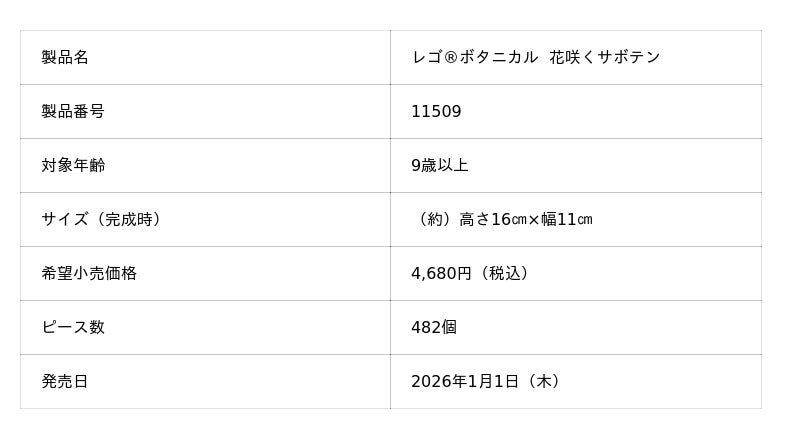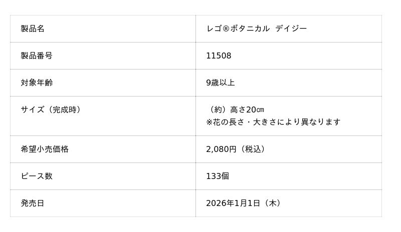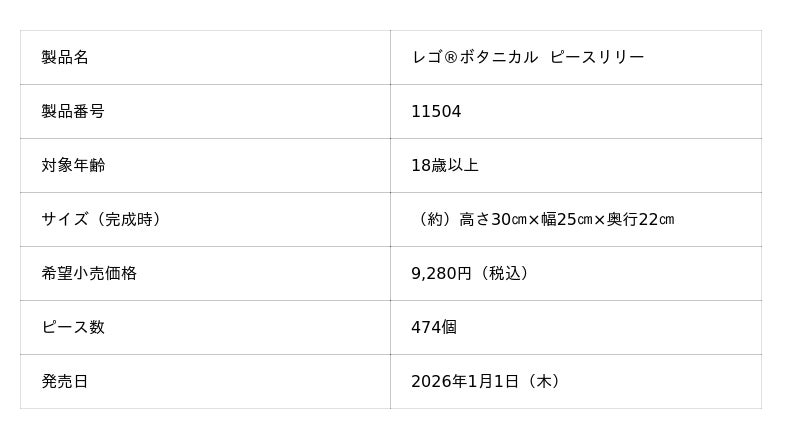 レゴジャパン株式会社(代表取締役社長:マイケル・エベスン/所在地:東京都港区、以下レゴジャパン)は、リアルな自然の美しい草花をつくりあげられる「レゴ(R)ボタニカル シリーズ」より4つの新製品を新たにラインアップします。「レゴ(R)ボタニカル チューリップのブーケ」「レゴ(R)ボタニカル ピースリリー」「レゴ(R)ボタニカル デイジー」「レゴ(R)ボタニカル 花咲くサボテン」は、2026年1月1日(木)より販売開始します。