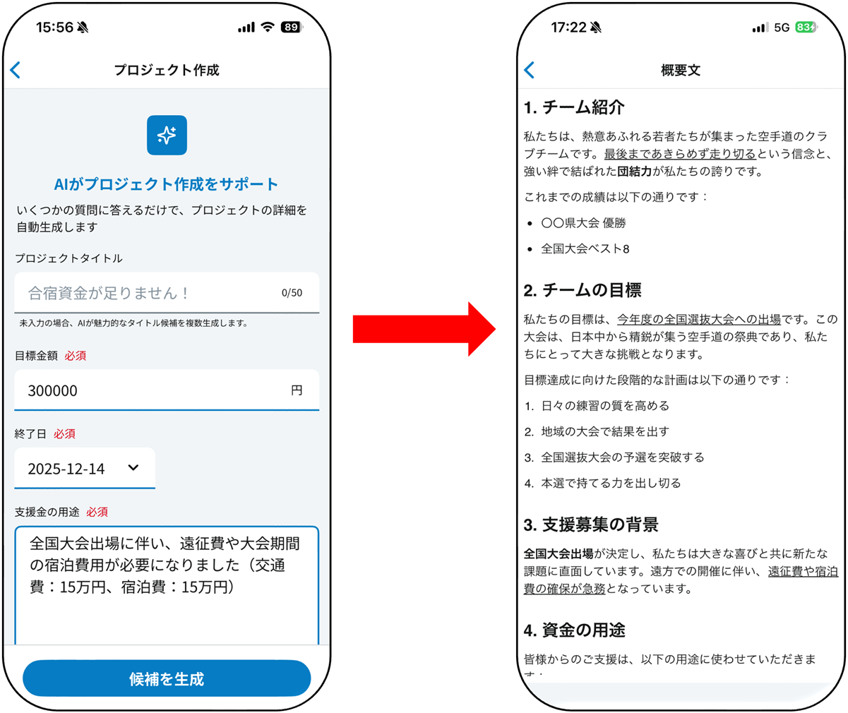 その支援のひとつとして、クラウドファンディングに初めて挑戦するチームでも迷わず準備を進められるようAIがクラウドファンディングページのタイトルや概要文を自動生成する「AIクラファン」機能を提供します。