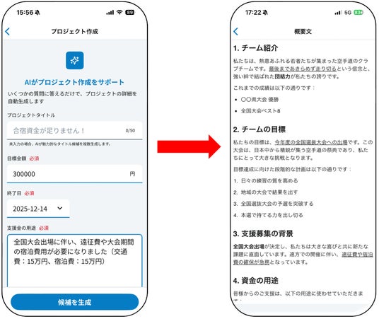その支援のひとつとして、クラウドファンディングに初めて挑戦するチームでも迷わず準備を進められるようAIがクラウドファンディングページのタイトルや概要文を自動生成する「AIクラファン」機能を提供します。
