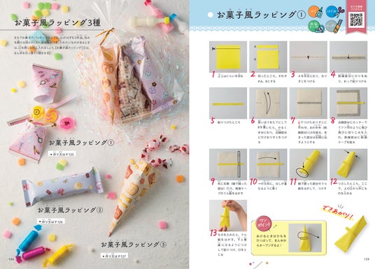 小さなお菓子や文具、シールなどのラッピングに活用できる折り方もたくさん紹介していますので、これからのイベントシーズンにぴったりです。もちろん、年末年始の工作にもおすすめ!