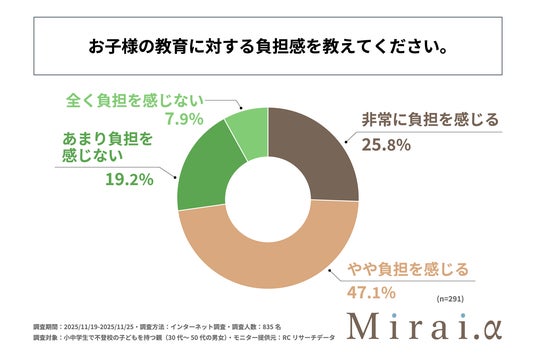 不登校の子どものために学校外の教育支援サービスを利用している親の7割以上が、子どもの教育に程度の差こそあれ負担を感じている
