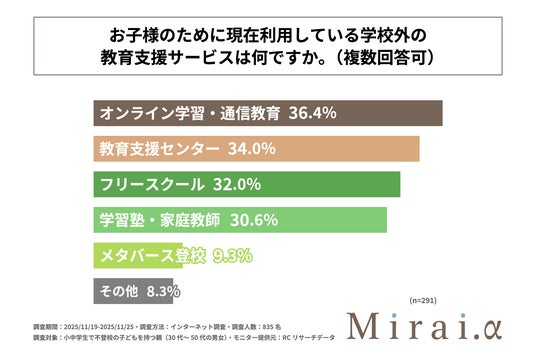 不登校の子どものために現在利用している学校外の教育支援サービスのトップ3は、1位「オンライン学習・通信教育」、2位「教育支援センター」、3位「フリースクール」