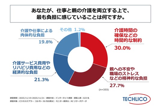 次に、介護に関わっている親が現在リハビリを受けていると回答した人を対象に「仕事と親の介護を両立する上で、最も負担に感じていることは何か」を尋ねる設問への回答では、1位が「介護時間の確保などの時間的な制約」で30.0%、2位が「親への不安や職場のストレスなどの精神的な負担」で27.7%、3位が「介護サービス費用やリハビリ費用などの経済的な負担」で21.3%という結果になりました。この結果から、ビジネスケアラーが、仕事と親の介護を両立する上で主に負担に感じていることは「介護時間の確保などの時間的な制約」や「親への不安や職場のストレスなどの精神的な負担」であることが明らかになりました。