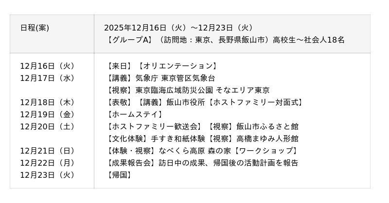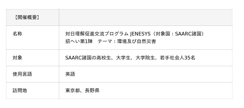 外務省が推進する国際交流事業「対日理解促進交流プログラム (JENESYS)」の一環として、SAARC加盟7か国の青少年35名が東京都と長野県(飯山市・白馬村)を訪問します。