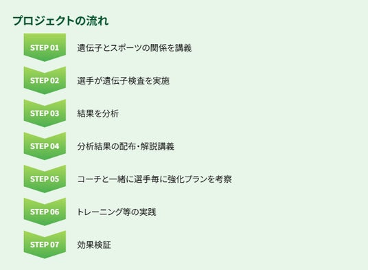 本プロジェクトは、遺伝子検査の結果を選手専用の分析レポートとして作成し、選手の遺伝的特性を客観的に可視化します。単なるデータ提供に留まらず、コーチとともに選手一人一人の特性に合わせた「勝つための個別最適化された強化プラン」を作成し、日々のトレーニングや栄養管理などに取り入れ、効果の検証まで行う継続的な取り組みです。