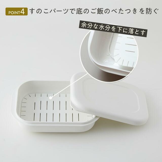 「極 冷凍ごはん容器 大」の最大の特長は、底面にセットされたすのこパーツ。解凍時に発生する蒸気や余分な水分が下に落ちることで、べたつきを防ぎ、粒立ちのいい食感を保ちます。