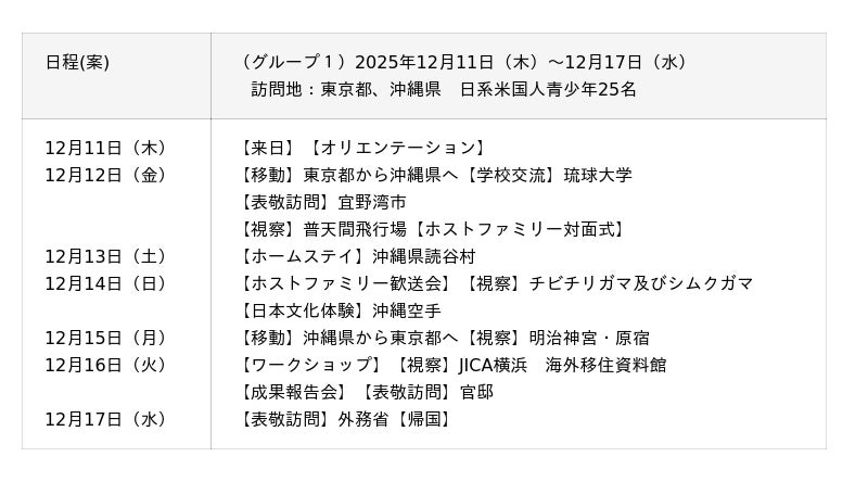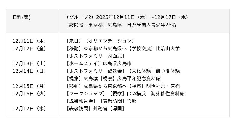 米国各地から日本にルーツを持つ青少年が来日し、東京都、広島県、沖縄県を訪問します。 滞在中、参加者は表敬訪問や視察を通じて、日本の政治や外交姿勢について学びます。また、ホームステイや文化体験、学校交流を行うことで、日本の社会、歴史、文化への理解を深めます。さらに、各地での人々との交流を通じて、日米両国の友好を育み、自身のルーツである日本を多角的に見つめるとともに、日本の魅力を吸収し、そこから得た学びや気づきを日系米国人の視点から積極的に発信します。