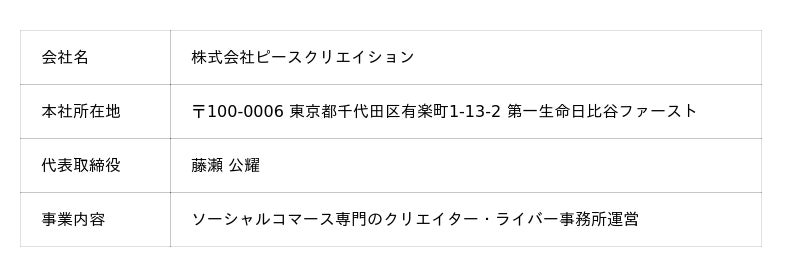 ピースクリエイションは、親会社の株式会社いつも(本社:東京都千代田区、代表取締役社長:坂本守)が14,000件以上のEC・D2Cの総合支援で培ったノウハウと、グループ会社の株式会社ピースユー(本社:東京都千代田区、代表取締役:藤瀬公耀)が提供する日本最大級のライブコマースアプリ「Peace you LIVE」の運営実績や、ライバーとのネットワークを活かした、ソーシャルコマース専門のクリエイター・ライバー事務所です。