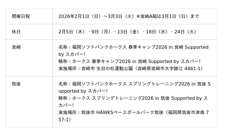 福岡ソフトバンクホークス株式会社(本社:福岡市中央区、代表取締役社⾧ CEO:後藤芳光)は、2026年2月1日(日)から3月3日(火)の期間で、春季キャンプとスプリングトレーニングを今年も宮崎県宮崎市と福岡県筑後市で開催することをお知らせします。