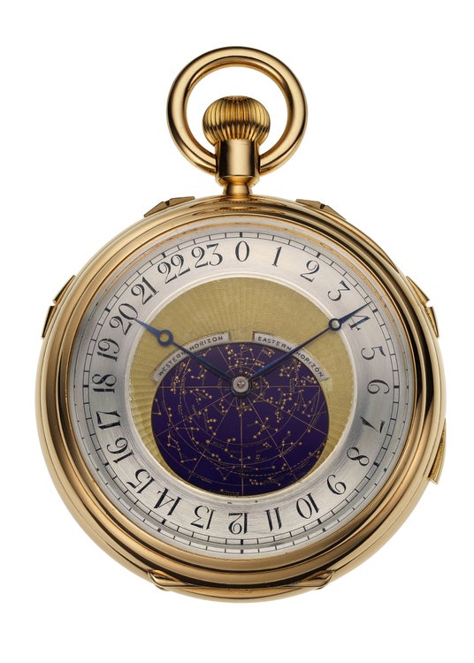18Kイエローゴールドケースの“グロス ピエス”は、オーデマ ピゲが製作した中で最も包括的な天文時計であり、スカイチャートを搭載した初期の作品のひとつです。ロンドンの夜空を315個の星とともに描き、恒星時、永久カレンダー、ムーンフェイズ、均時差を表示します。20世紀に製作されたオーデマ ピゲ唯一の超複雑懐中時計であり、ミニッツリピーター、グランド&プチソヌリ、クロノグラフ、そしてAPの懐中時計では当時唯一のトゥールビヨンを備えています。