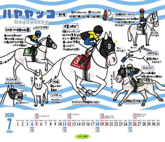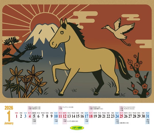「スポーツ報知」を発行する報知新聞社(代表取締役社長・長谷川剛)は、全国の競馬ファンを魅了する馬のイラストレーター・おがわじゅりさんが描いた、実在馬と架空馬を組み合わせたイラストカレンダーの販売を始めました。色彩も鮮やかで、季節にマッチした可愛らしい表情や、躍動感あふれる競走馬や架空馬が卓上判に収まっています。さらに2026年のJRA開催日程(レーシングカレンダー)がイラスト面、カレンダー面の両方に掲載されている実用性抜群なカレンダーとなっています。