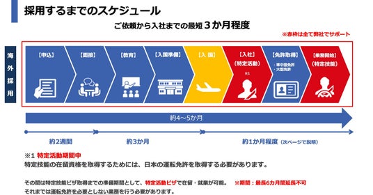 基本的には、採用から入国までの教育として交通ルールやマナー外免切替対策講習に加え、日本語評価試験N4レベルの合格と技能評価試験の合格が必須条件となる。さらにはビザ手続きにも時間を要するため、すべての行程を合わせるとどうしても採用から入社まで約1年程度の期間が見込まれる。