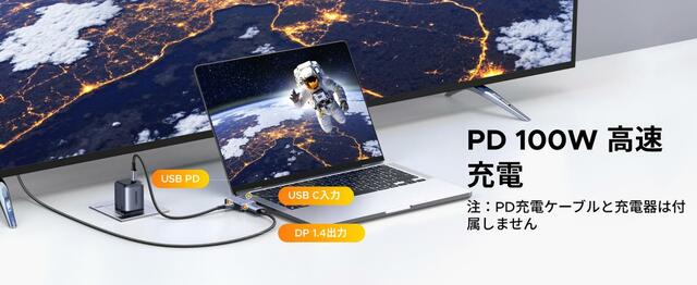 アダプターに充電器を接続すれば、モニターに映像を出力しながらMacBook Pro/AirやiPadなどの接続デバイスを最大100Wで急速充電できます。