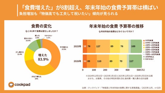 利用者数No.1レシピサービス「クックパッド」を運営するクックパッド株式会社は、「物価高と年末年始の食費に関する実態調査」を実施しました。昨年から食費が増えたと回答した人は83.9%に対し、年末年始(12/31~1/3)の食費予算帯は横ばいです。それでも約5人に1人(21.1%)がカニを諦める予定であることがわかりました。本リリースでは「予算を抑えても豪華」「子どもが喜ぶ」などのニーズに応える年末年始レシピを提案します。
