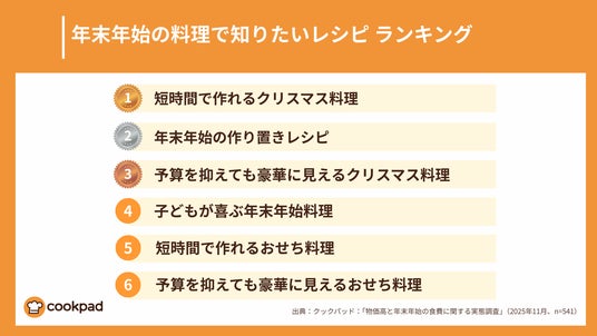 年末年始の料理で知りたいレシピは、「短時間で作れるクリスマス料理」26.7%、「年末年始の作り置きレシピ」24.3%、「予算を抑えても豪華に見えるクリスマス料理」22.4%、「子どもが喜ぶ年末年始料理」20.6%、「短時間で作れるおせち料理」19.1%、「予算を抑えても豪華に見えるおせち料理」16.0%が上位。