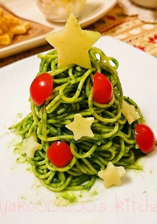 フレッシュバジルより安くて手に入りやすいほうれん草パスタでソースを作り簡単オシャレなクリスマスツリーに♪彩りも良く、クリスマスパーティーにもピッタリ。
