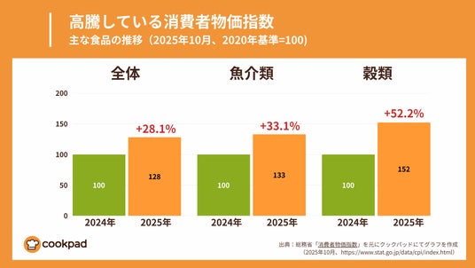 2025年10月の消費者物価指数(2020年基準=100)によると、食料全体は128.1(+28.1%)、魚介類は133.1(+33.1%)、穀類は152.2(+52.2%)と、食卓の基本食材が軒並み3~5割上昇(※2)。物価高が家計を直撃しています。