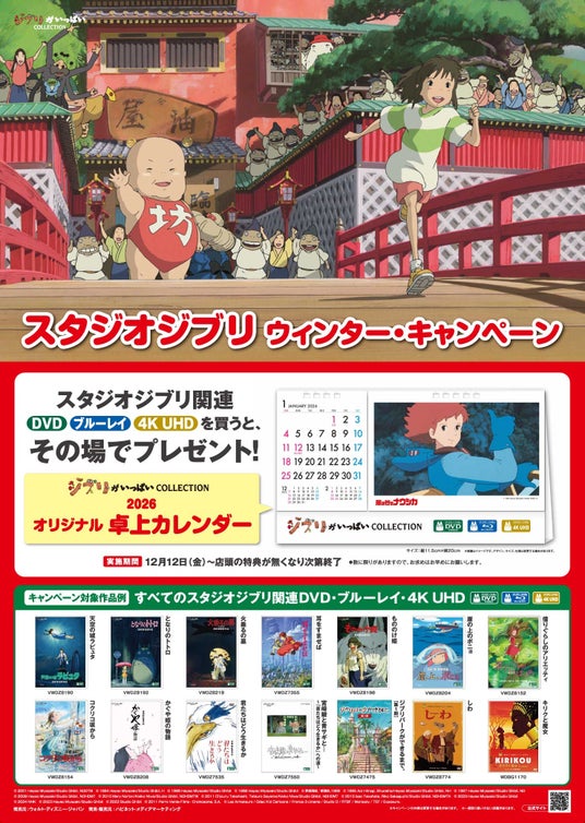 店頭でスタジオジブリ関連作品のブルーレイやDVD、4K UHDを購入すると、その場で“ジブリがいっぱいCOLLECTIONオリジナル 卓上カレンダー2026”がもらえるキャンペーンです。
