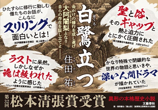 比叡山の〈千日回峰行〉に挑む2人の仏僧を描いた衝撃作『白鷺立つ』は、第32回松本清張賞受賞作にして、住田さんのデビュー作。松本清張賞受賞作がいきなり直木賞候補となるのは、2004年の『火天の城』(山本兼一さん)以来、21年ぶりです。また、デビュー作でのノミネートは逢坂冬馬さんの『同志少女よ、敵を撃て』以来です。