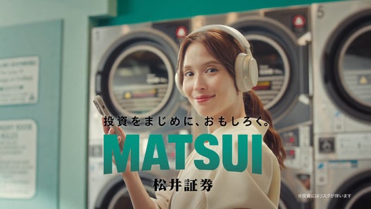 広瀬アリスさんがとあるコインランドリーを訪れます。洗濯のスキマ時間で、スマホを手に取り確認すると、自身の投資状況が好調なのか、思わず笑みがこぼれてしまいます。"洗濯をしながら投資"という、生活の延長線上にある投資体験を通して、「投資=特別なこと」ではなく「自身の生活の一部」へと変わっていく様子を描いています。また、CM楽曲には、誰もが一度は耳にした名曲「はじめてのチュウ」をアレンジしました。テンポのあるリズムと軽快なサウンドに乗せて、"松井で投資チュウ~♪"というフレーズが心地よく響きます。親しみのあるメロディに遊びのある言葉づかいを織り交ぜ、投資への"第一歩"を踏み出すワクワク感を演出しています。広瀬さんの自然体な笑顔とリズミカルな演出が調和し、日常の中で“投資を楽しむ新しい自分”に出会うような爽やかな映像に仕上がっています。