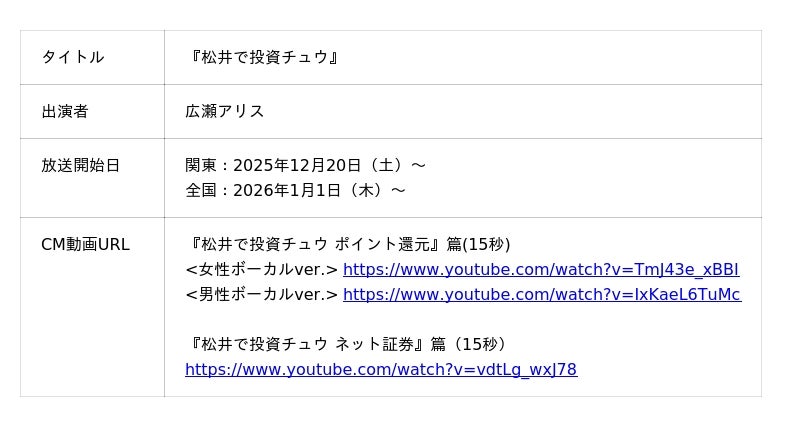 松井証券株式会社(本社:東京都千代田区、代表取締役 社長執行役員:和里田 聰、以下「当社」)は、俳優の広瀬アリスさんを起用した新TVCM『松井で投資チュウ ポイント還元/ネット証券』篇を2025年12月20日(土)より放映開始します。