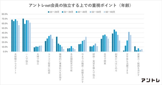 また、独立時に重視するポイントは「未経験からスタート」「一人で独立」「副業」が上位に並びました。年代別では、20代は挑戦型、50-60代はこれまでの職歴を活かす実績重視型と、年代によって独立する上で重視するポイントが大きく異なることが明らかになりました。