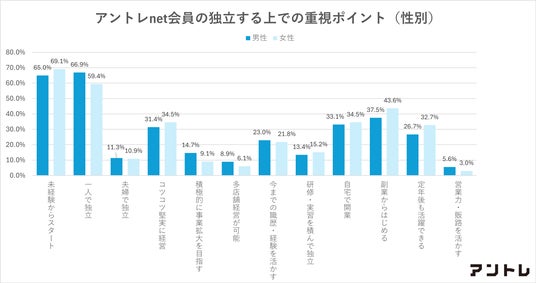 なお、性別で見ると、男性は「一人で独立」「積極的に事業拡大を目指す」「多店舗経営を視野に入れる」といった項目が全体に比べてより高く、一方で女性は「未経験からスタート」「コツコツ堅実に経営したい」「副業から始める」「定年後も活躍したい」といった項目が平均より高いという結果でした。女性のほうが、より堅実志向でスモールスタートを選ぶ傾向にあるようです。