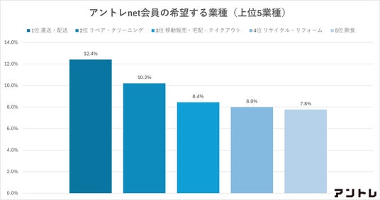 アントレnetの会員が希望する業種は、「運送・配送」が12.4%が最多となり、「リペア・クリーニング」が10.2%、「移動販売・宅配・テイクアウト」が8.4%と続きました。また、リサイクル・リフォームや飲食など、生活ニーズが安定している領域にも一定の関心が集まっています。