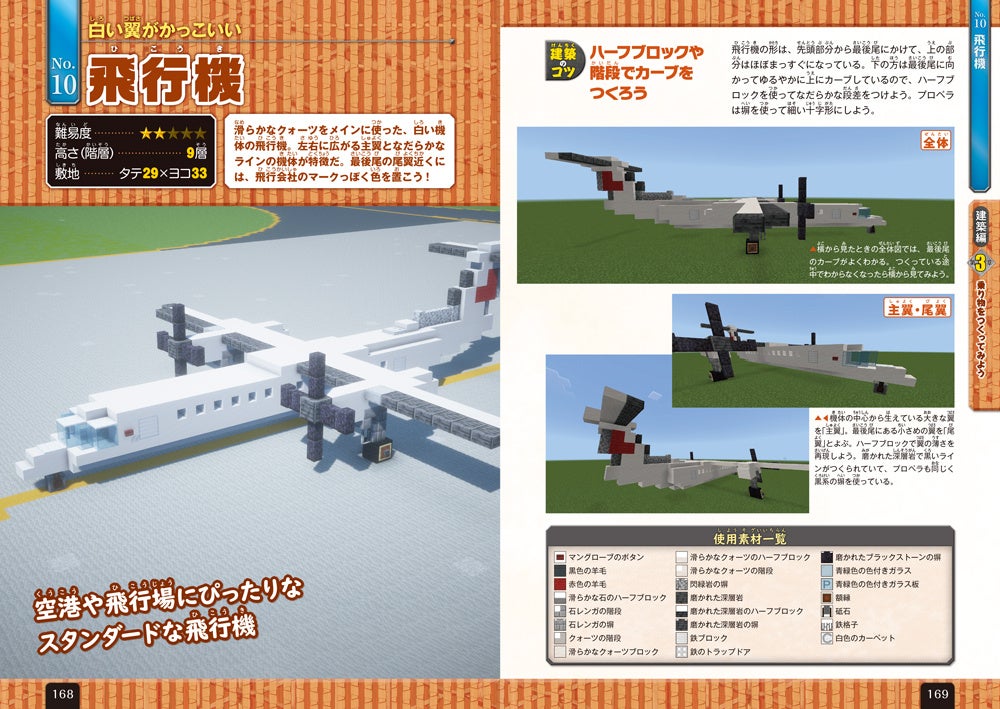 本書は、YouTubeなどで活躍する人気クラフターが手掛けた「現代的な建物&のりもの」を多数収録。それらを「家」「ビル」「のりもの」の3つに分類して、11種類の建築物を紹介しています。すべての建物が、1層ごとのマス目状の用紙に必要な素材とその置き方をアイコンで表した設計図付きです。設計図ではブロックを置く向きまでわかるほか、難しいポイントは実際のゲーム画面を添えてフォローしています。本章のやり方を真似るだけで、大きな建築物も迷うことなく組み立てられます。