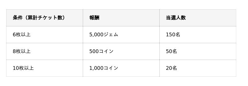 チケットは全部で10枚。累計チケット数に応じて抽選で以下の報酬が贈呈れる。