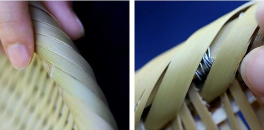 縁の部分は、竹ヒゴを巻きつけてしっかりと針金で固定。外側から針金が見えないよう工夫されており、細部にまで配慮が行き届いた仕上がりです。