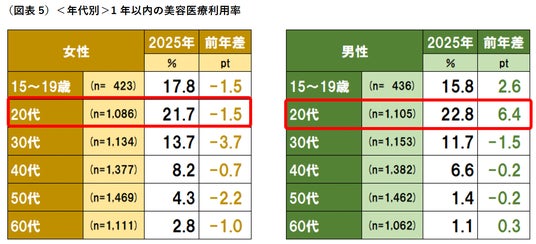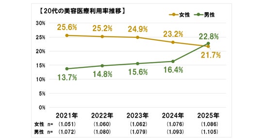 20代男性の美容医療利用率は22.8%で、同年代女性(21.7%)をわずかに上回る結果に。