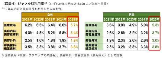 男性の1年以内の美容医療利用率は8.8%と2021年から増加傾向で、ここ5年で最も高い水準となりました(図表4)。特に20代男性は22.8%で、同年代の女性(21.7%)を初めて上回っています(図表5)。一方で、女性の利用率は10.2%(前年差-1.8ポイント)と減少し、2024年まで続いた増加傾向に一服感が見られました(図表4)。ジャンル別では「医療脱毛」「美容内科・美容皮膚科」の利用率が前年と比べ減少しています(図表6)。ここ1~2年の脱毛クリニックの相次ぐ倒産なども心理的に利用の抑制につながっている可能性があります。また、自宅での脱毛器の使用や、セルフ脱毛サロンなどの利用の増加も影響しているとも考えられます。