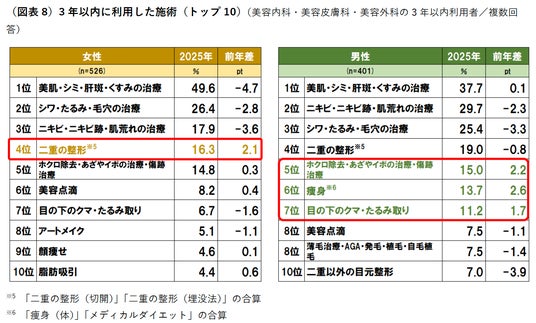 1年間の平均施術費用は男女ともにどのジャンルも前年と比べ低下しており、施設間の競争激化による価格の低下が影響していると考えられます(図表7)。また、3年以内に利用した施術内容を見ると、女性では「二重の整形」が増加、男性では「痩身」「ホクロ除去・あざやイボの治療・傷跡治療」「目の下のクマ・たるみ取り」が増加しています。「痩身」は女性のトップ10にはランクインしておらず、男女によって施術の利用に差があることが分かります(図表8)。